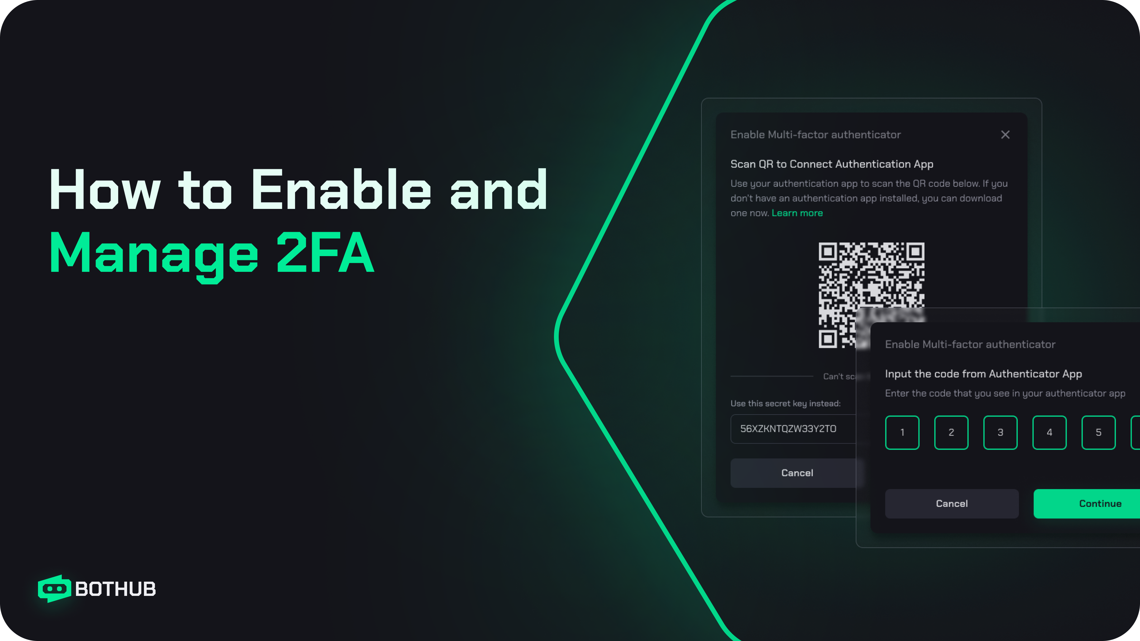 On the Bothub 2FA setup screen, you’ll see a QR code and a backup key.