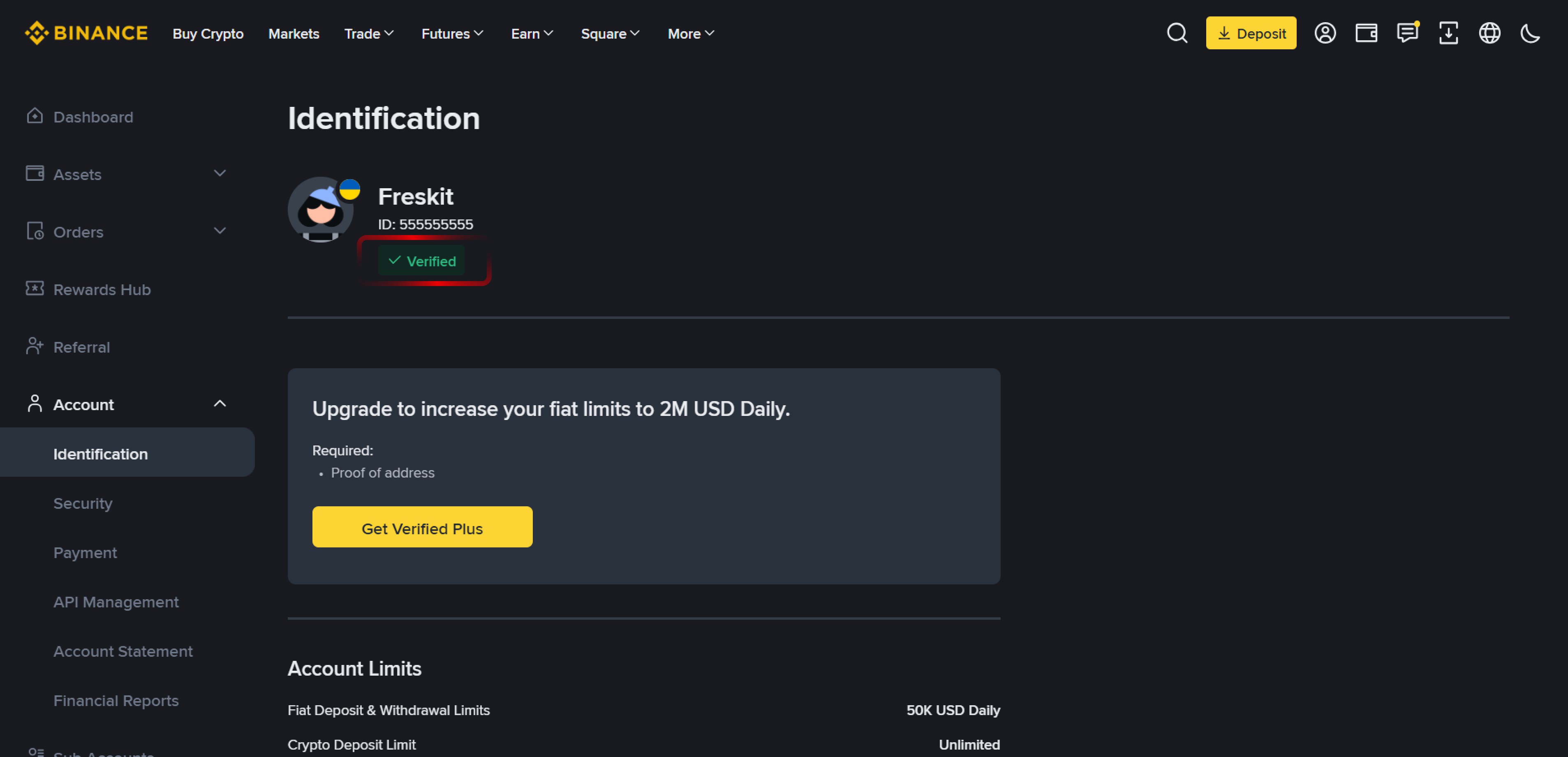 3. Kontrollera att ditt kontostatus visar ”Verifierad” under Identifieringsavsnittet.
