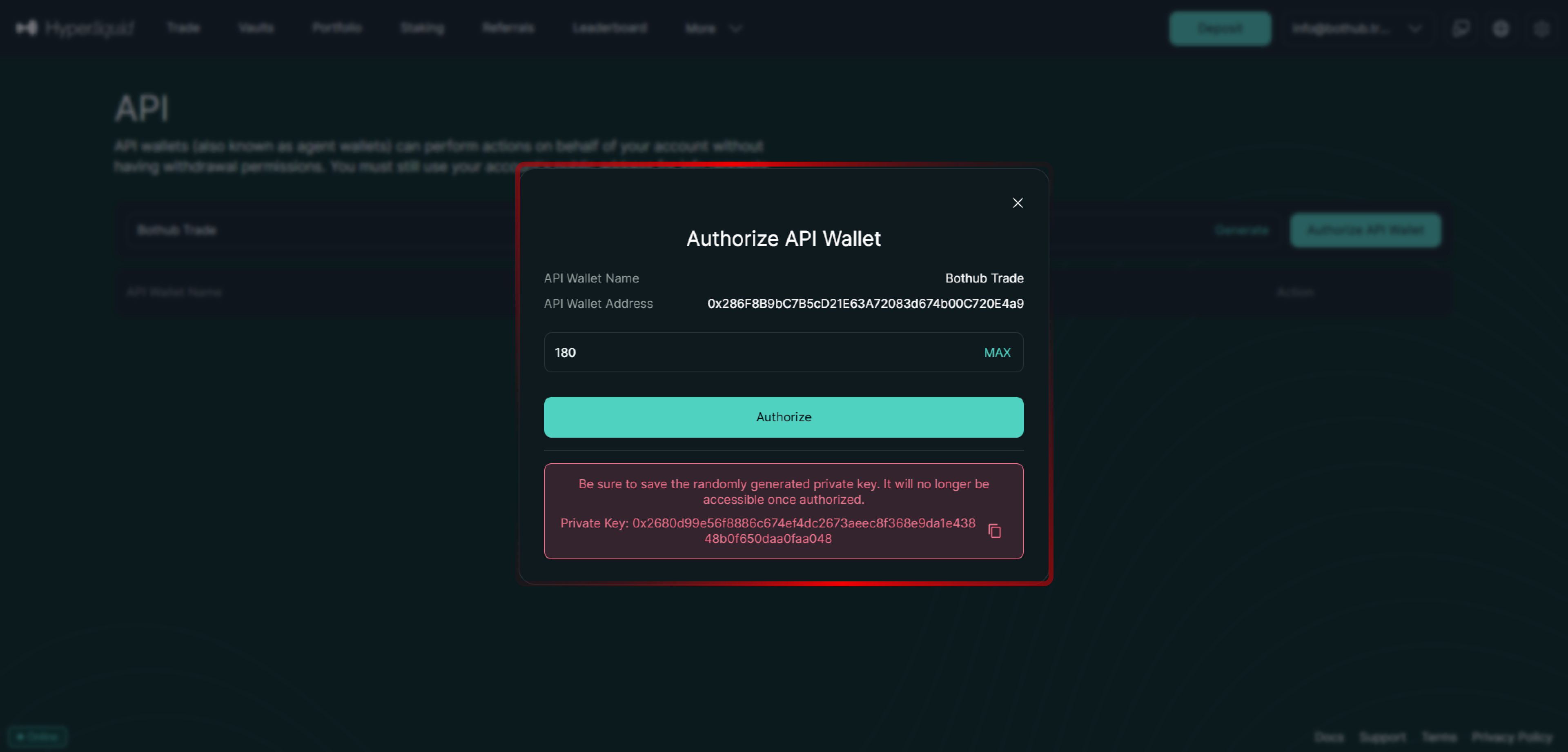 Gå tillbaka till HyperLiquid och klicka på Auktorisera för att slutföra skapandet av API-nyckeln.