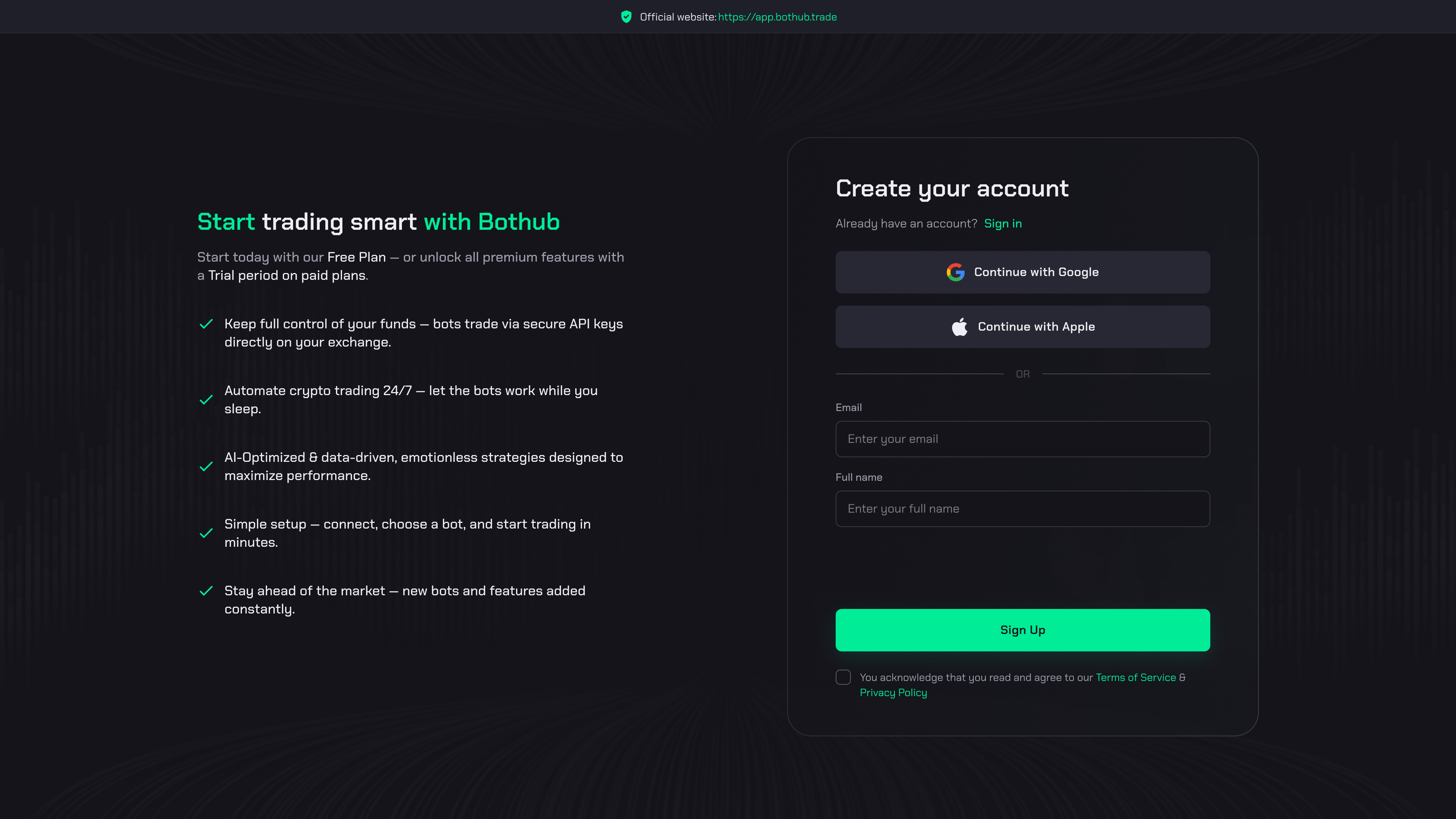 Detta är det snabbaste alternativet – bara ett klick, så skapas ditt Bothub-konto direkt. Genom att registrera dig med Google eller Apple godkänner du automatiskt våra: