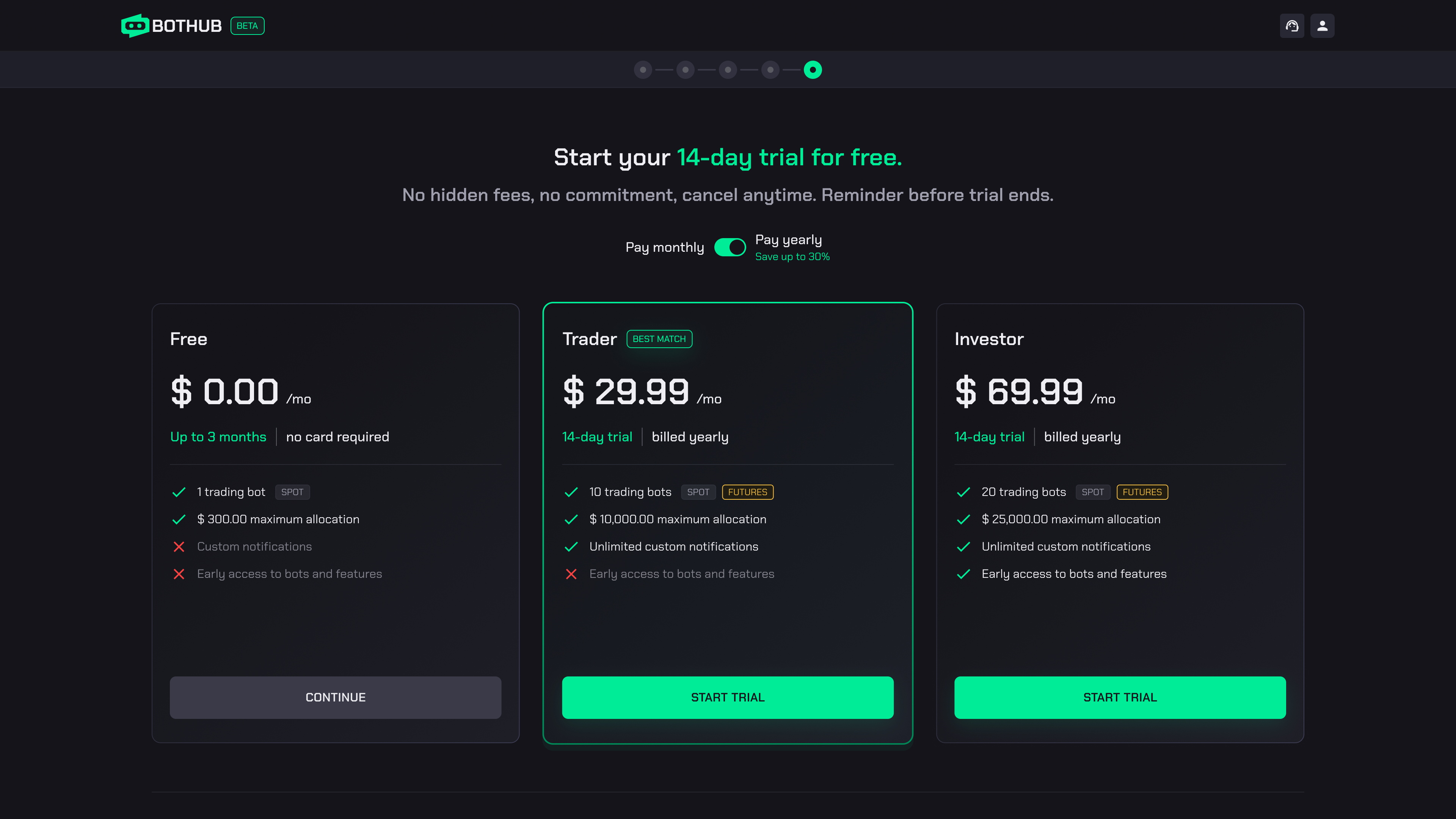 - Välj en betald plan (Trader eller Investor) och börja din 14-dagars provperiod.