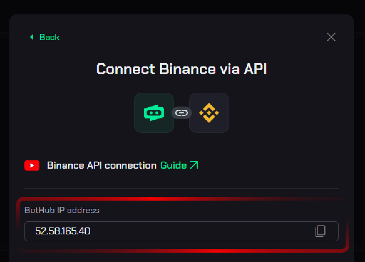 Öppna nu Bothub och kopiera IP-adressen som visas i modalen "Connect Exchange". Klistra in denna IP-adress i fältet på Binance och bekräfta.