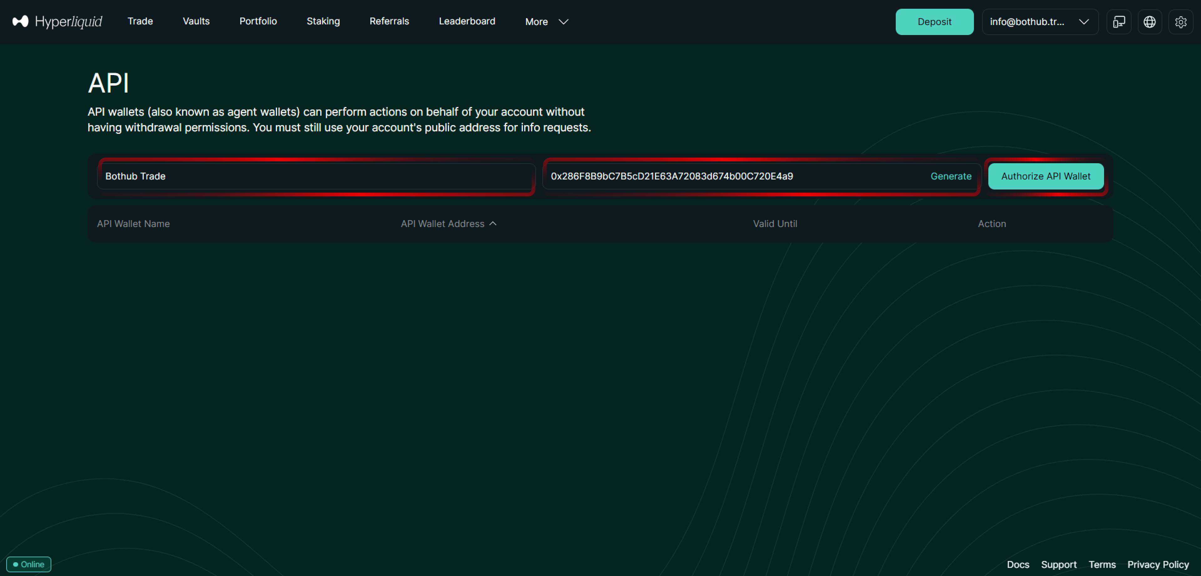 3. Under Address of API Wallet klickar du på Generate — detta skapar din API-plånboksadress.